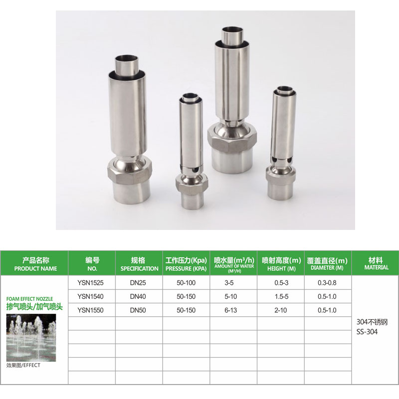 A variety of stainless steel nozzles are an ejector nozzle with adjustable size and direction, which can produce a lively full-water mode and provide oxygen enrichment. Through the action of the ejector, water and air are attracted by the ejector jet and mix thoroughly and accelerate into the air, acting as an impressive soft flowing fountain.