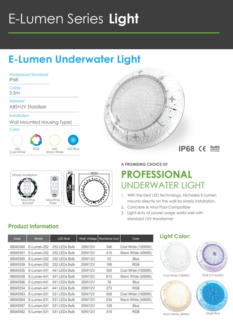 Emaux’s E-Lumen Underwater Light is the industrial leading Nicheless LED pool and spa light, designed to deliver brilliant and vibrant colors by a single light. The single color options maximize the brightness of your pool. The party themes run through your pool and spa by E-Lumen 6 brilliant rich colors and 8 colors pre-programmed light show. With the best LED technology, Nicheless E-Lumen mounts directly on the wall for simple installation. Only required a few bolts, this is the most convenient choice for professional underwater light.